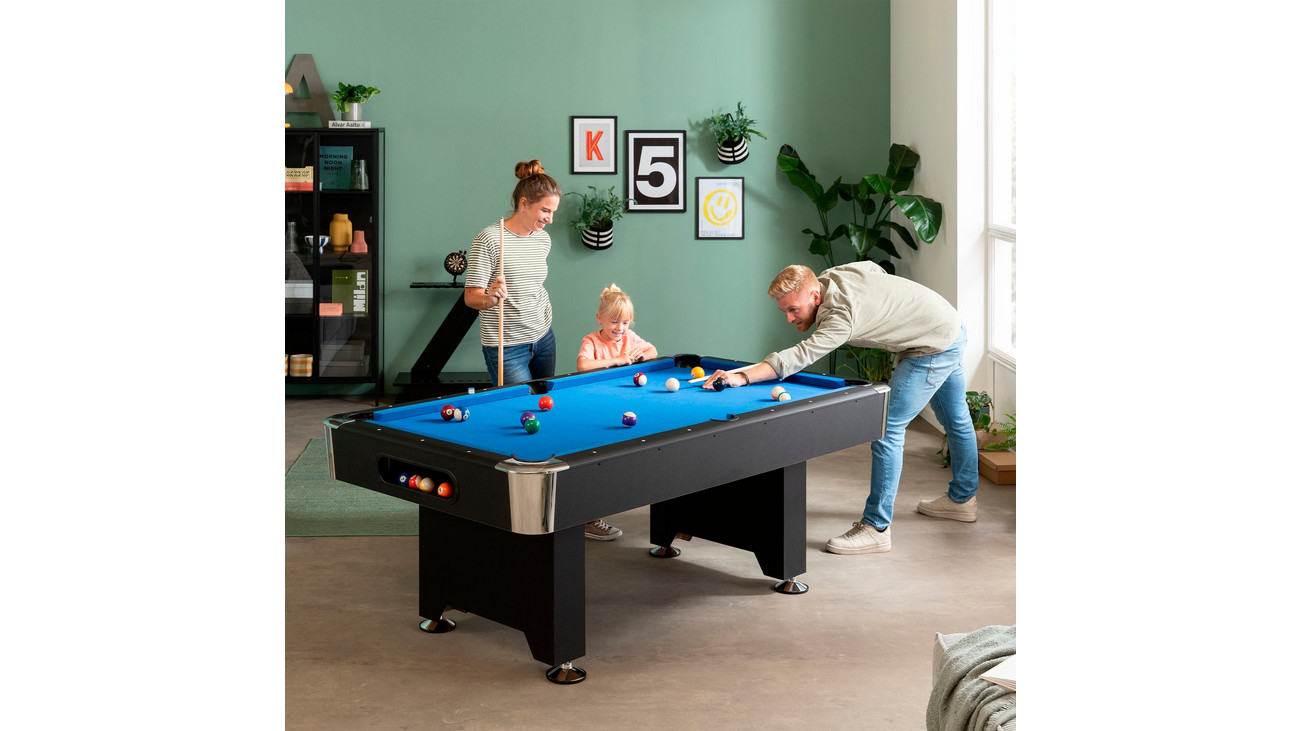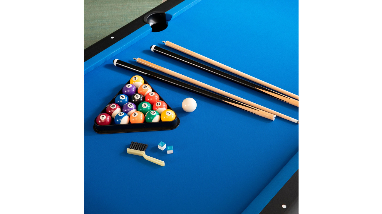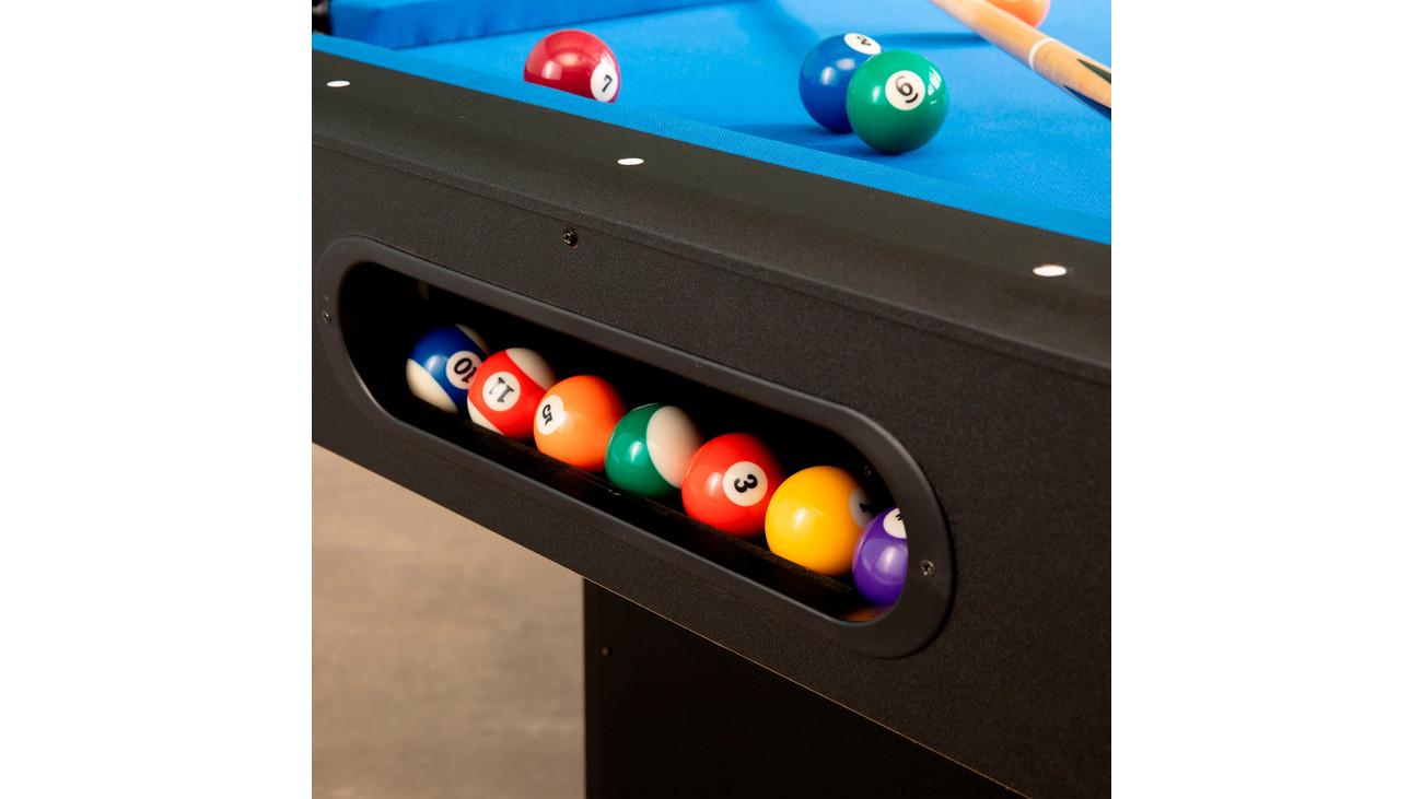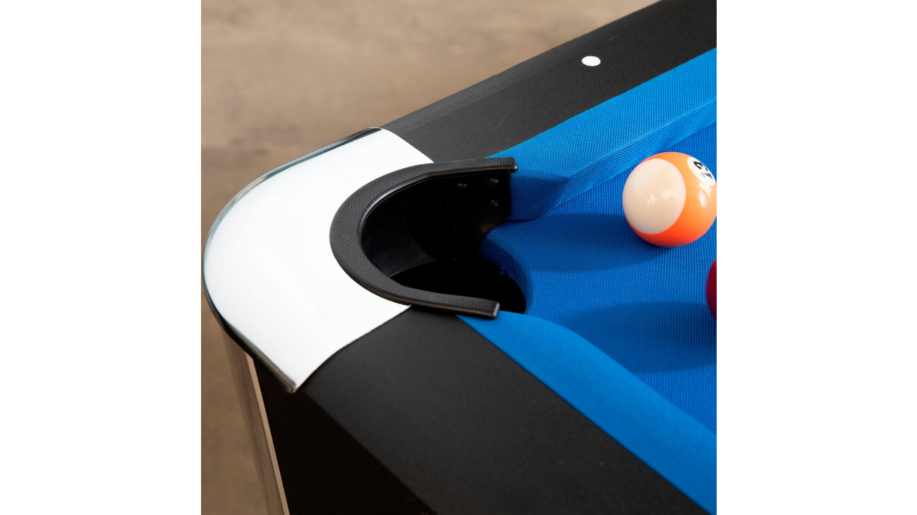• mit einem blauen, robusten und haltbaren Billardtuch