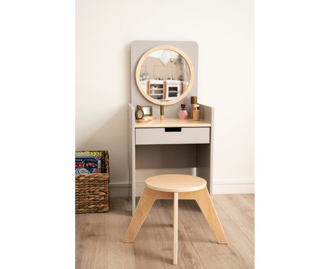 • ein Spiegeltisch mit Schublade und einem Hocker