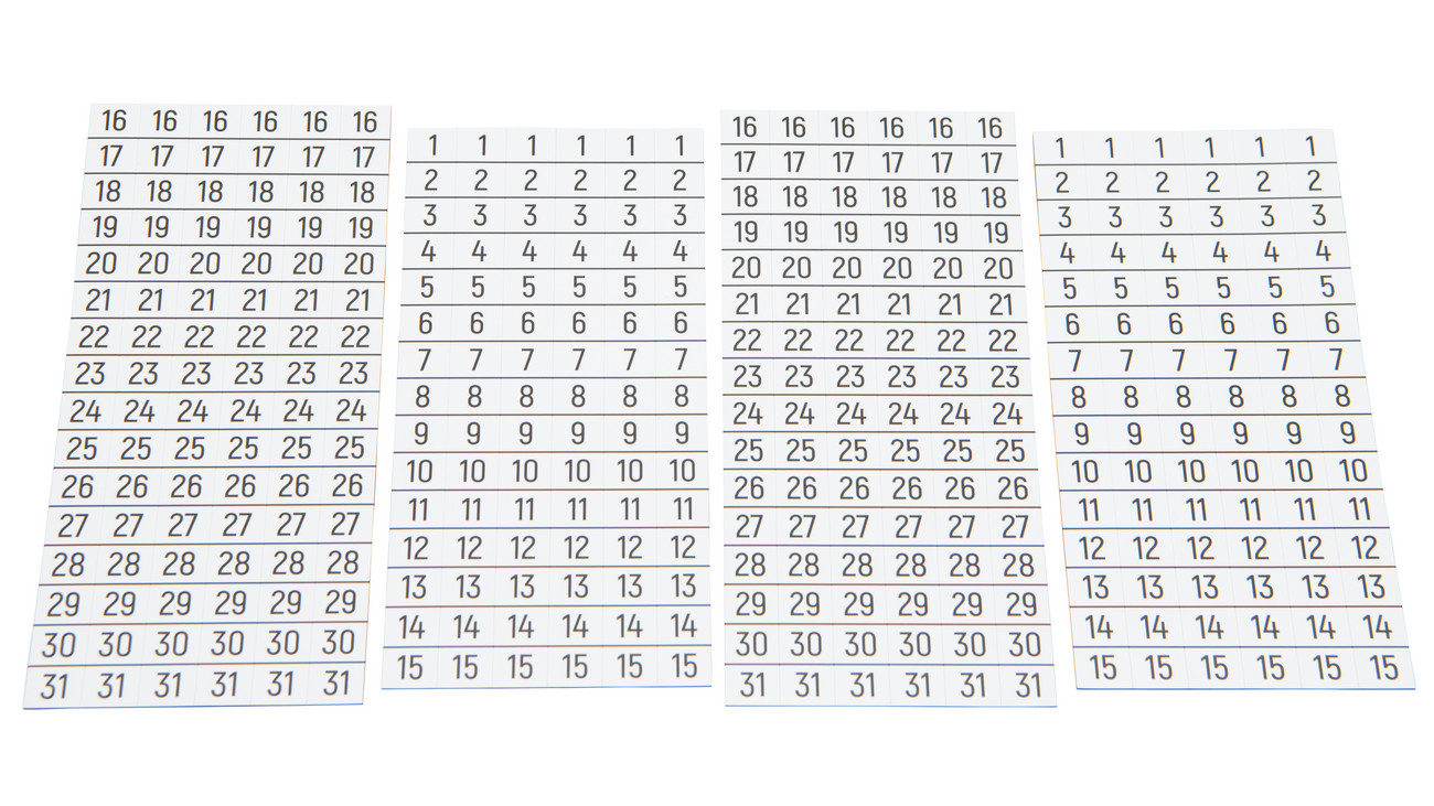 - je 12 Zahlen 1 bis 31, ca. 1,8 x 1,8 cm