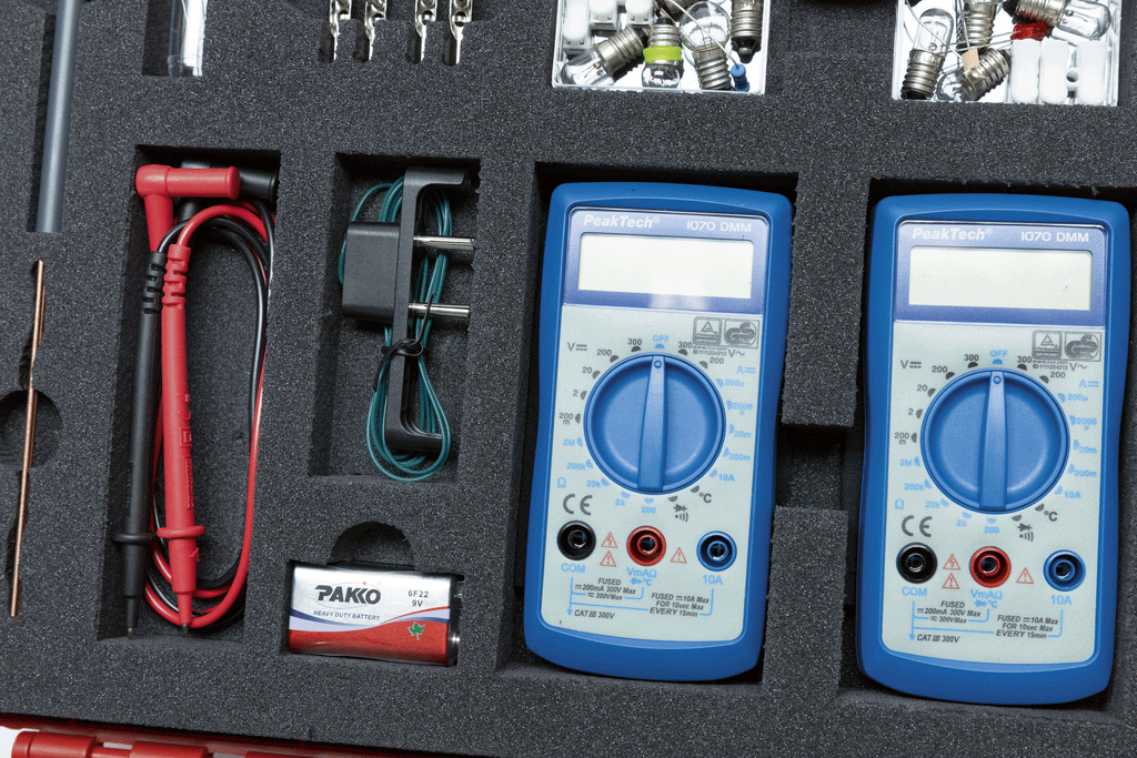 • 6 Versuche: 1 - Geschlossener Stromkreis, 2 - Die Mikrowellenschaltung, 3 - Die Türklingelschaltung, 4 - Der Leistungstester der Flüssigkeiten, 5 - Methode: Elektrische Versuche mit dem Netzgerät, 6 - Untersuche elektrische Felder