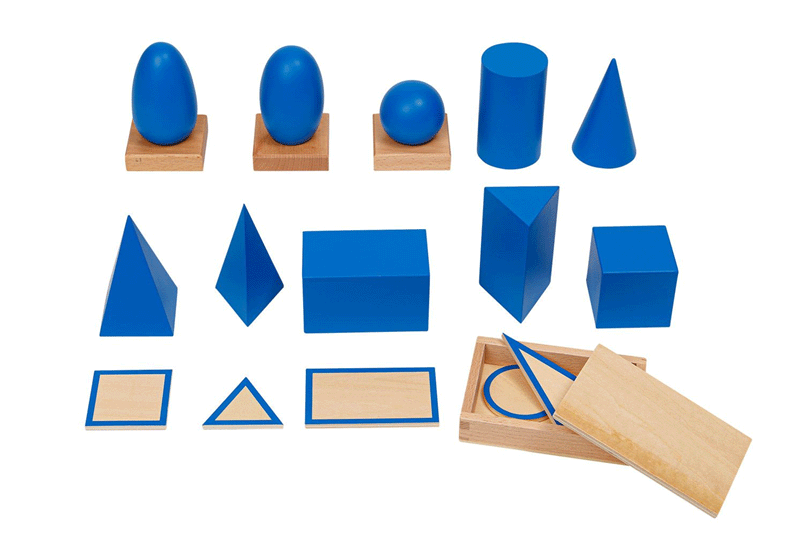 10 geometrische Körper, 3 Ständer, (1 Kubus 6 x 6 x 6 cm, 1 Quader, 1 Kugel Ø 5,4 cm, 1 Ovoid (Ei) 9,2 cm hoch, Ø 5,4 cm, 1 Ellipsoid, 1 Zylinder, 1 Vierseitige Pyramide, 1 Dreiseitige Pyramide, 1 Kegel, 1 Dreiseitiges Prisma)