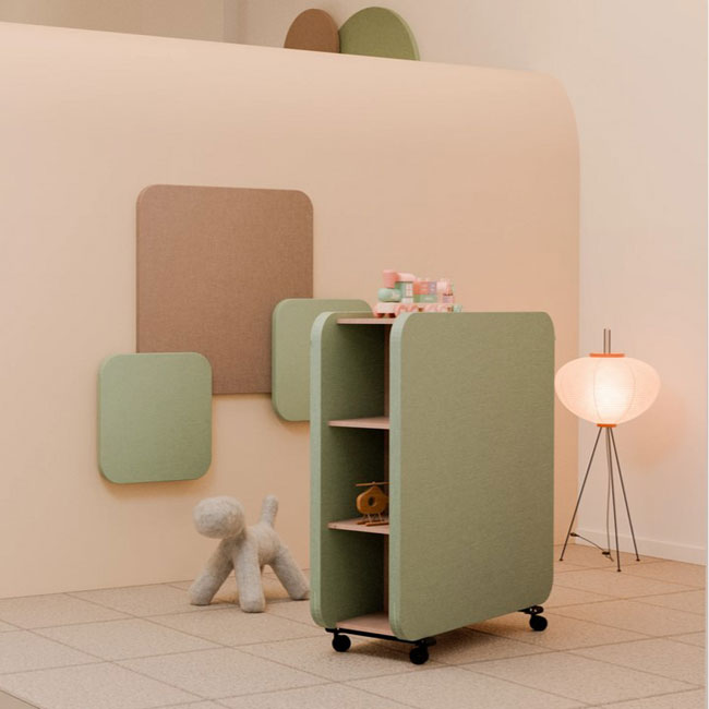• 6 Fächer mit seitlichen Akustikpaneelen in 6 Farben