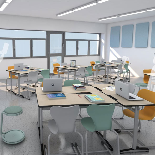 • strapazierfähige Tischplatte mit abgerundeter Kante und Stiftablage