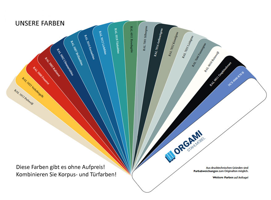 Bitte im Bestellverlauf gewünschte Stahlfarben für Korpus und Türen angeben.