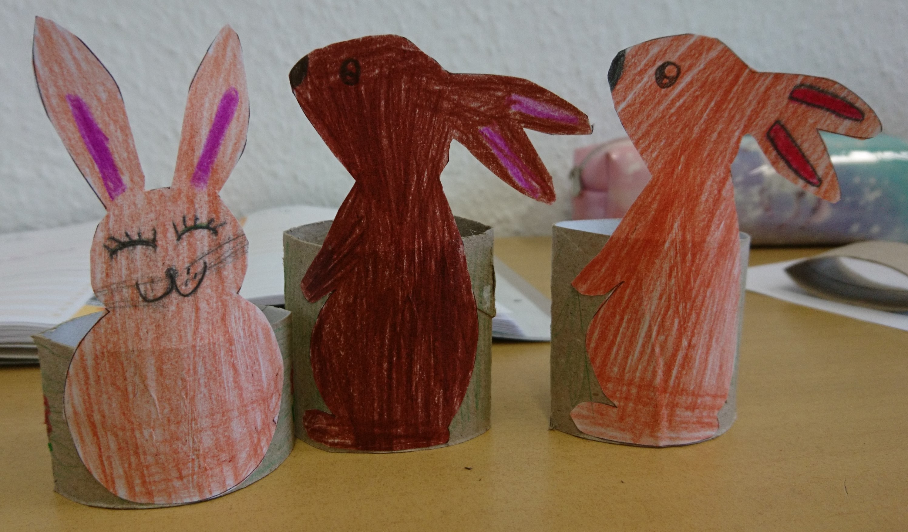 2. Nun wird ein Osterhase oder ein anderes Ostermotiv auf die Papprolle geklebt. Dafür kann das Kind entweder den Hasen mit Hilfe einer Vorlage aus dem Tonpapier ausschneiden oder es malt selbst einen Hasen, der anschließend aufgeklebt wird.